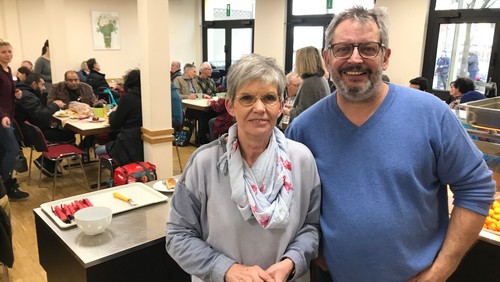 Marianne und Ralf Schröder, die Küchenchefs der Kaffeestube Gutleut blicken gemeinsam mit Pfarrer Andreas Klein dankbar auf 14 Tage zurück, in denen bedürftige Menschen aus dem ganzen Bahnhofs- und Gutleutviertel ein warmes Essen bekommen haben, Tee und Kuchen gereicht wurden. Es wurde gesungen, es wurde auf gute Worte gehört, es war eine gelöst fröhliche Atmosphäre im Raum!