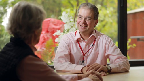 Im Johanna-Kirchner-Altenhilfezentrum leben 200 Menschen im Pflegeheim, 150 in Seniorenwohnungen. Haß führt die meisten Gespräche im Pflegeheim. Nicht nur mit Patienten, sondern auch mit Angehörigen und Pflegenden. „Ich bin zum Beispiel da, wenn erwachsene Kinder schockiert sind, weil die eigenen Eltern sie nicht mehr erkennen“, erzählt er. „Oder wenn eine junge Pflegende zum ersten Mal ins Zimmer eines Verstorbenen gehen muss.“